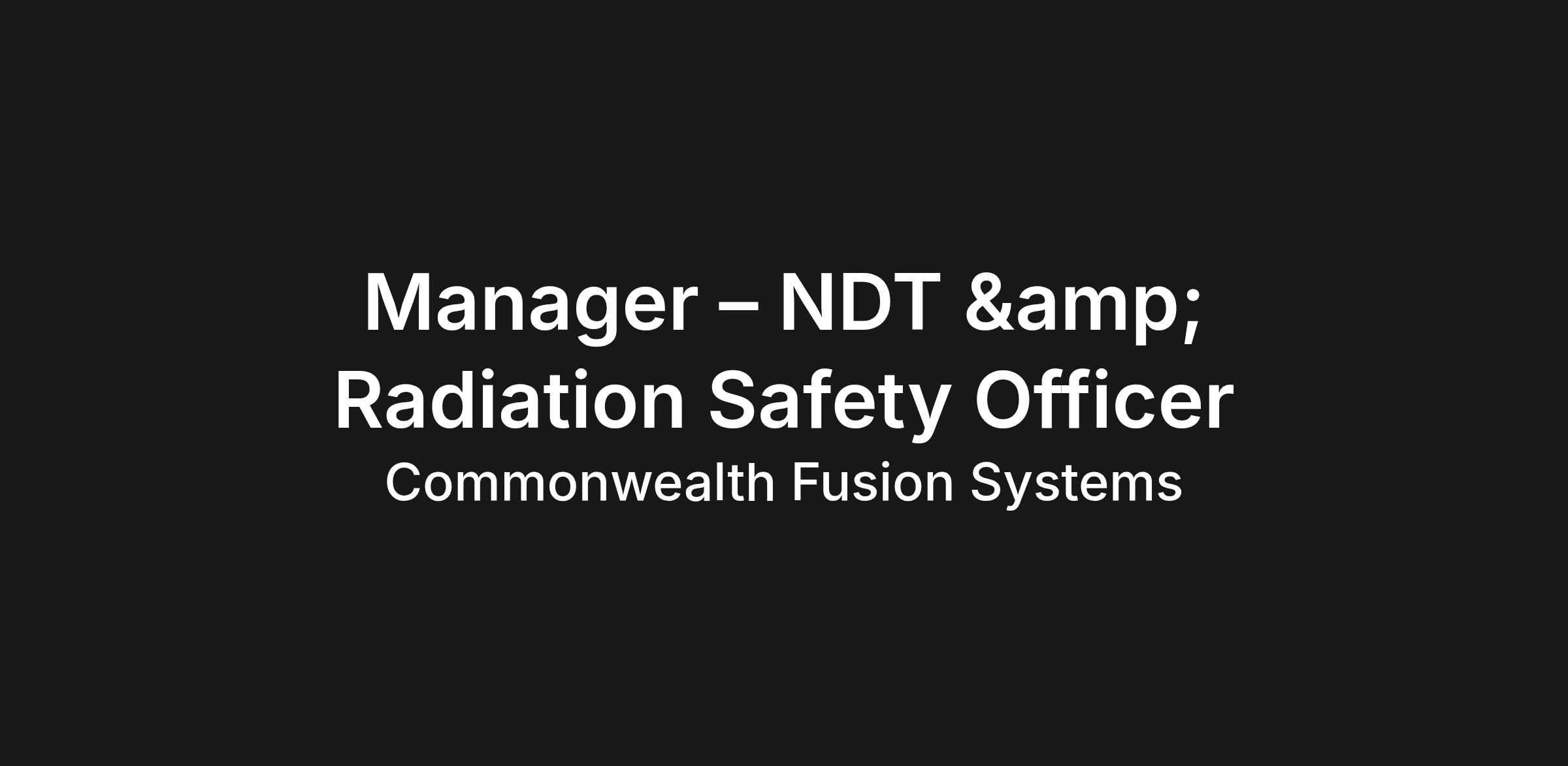 The Manager of NDT and Industrial RSO is the technical owner of NDT Operations and industrial radiography radiation safety at CFS. This role is responsible for developing and maintaining the organization's NDT capabilities to ensure successful delivery of SPARC and to prepare for the future scaling for ARC power plants.