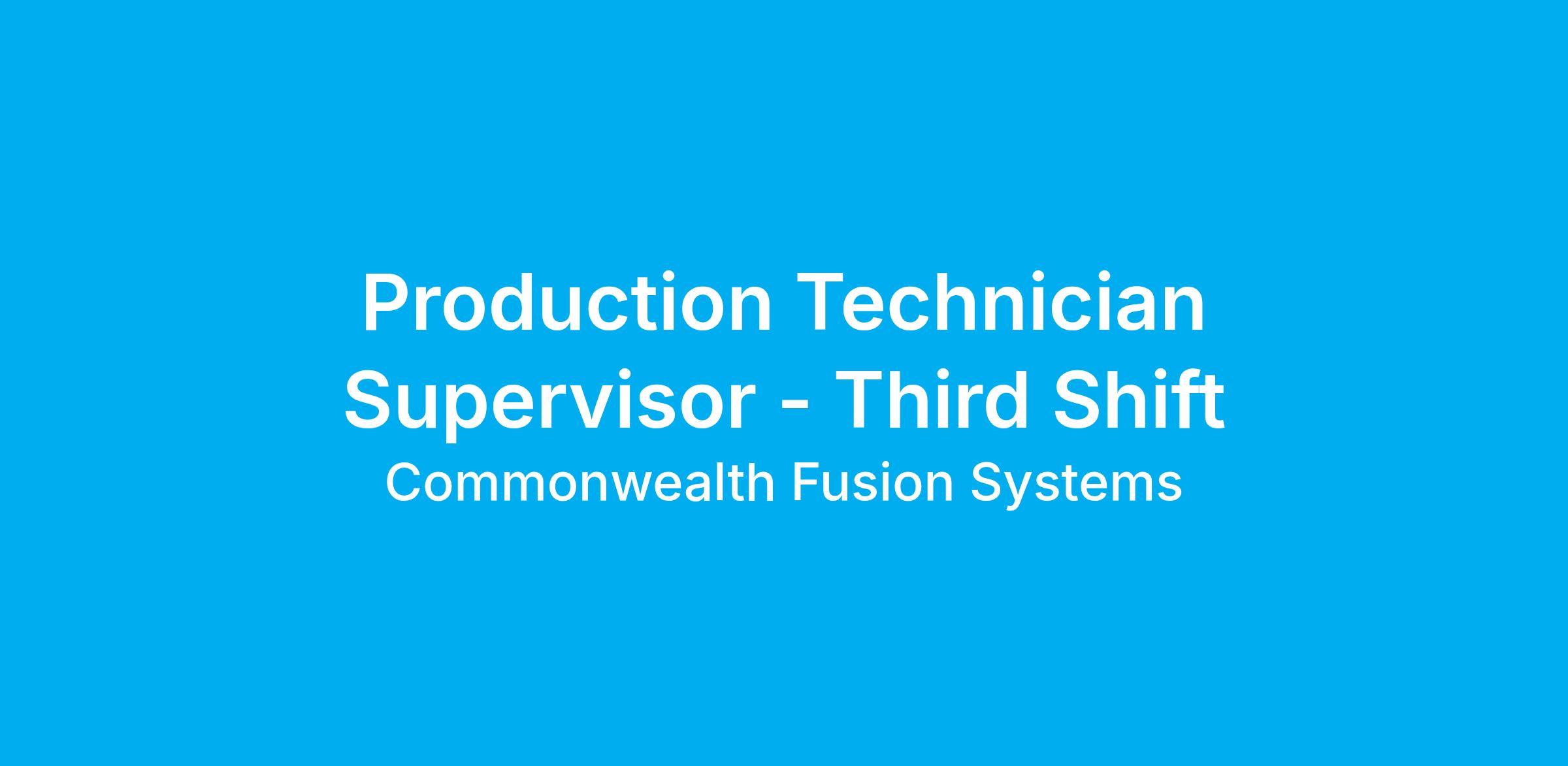 We're looking for experienced and highly motivated Production Supervisors to join Commonwealth Fusion Systems. The Production Supervisor role will be responsible for leading our high performing team consisting of a multitude of different technician and welding skill sets. The ideal candidate will have proven leadership experience, exceptional people skills, and a passion for always improving. They’ll be working cross functionally with other internal members to develop and manage production team members.