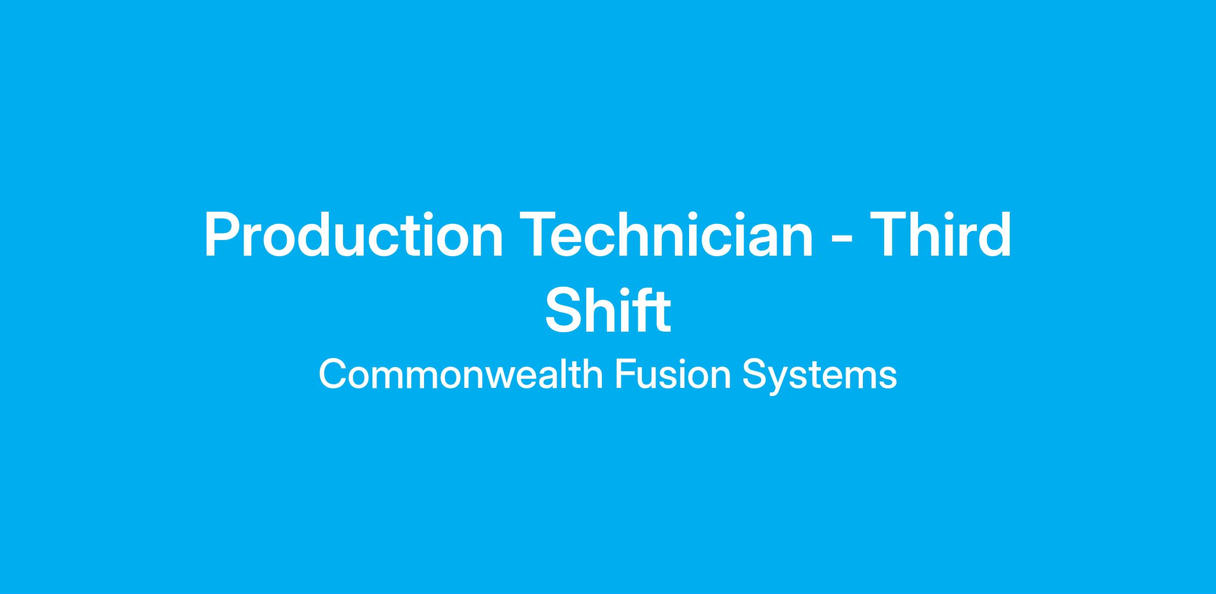 The production technician - second shift position is an integral part of the CFS team performing and monitoring the manufacturing processes required to build and test superconducting magnets. You will have the opportunity to work within a fast-paced, exciting atmosphere to help the team meet the global necessity for clean energy. Ensures functional operation and preventative maintenance of equipment and continuous improvement. Responsibilities include close cooperation with Operations, Maintenance, Quality and other departments to ensure goals and objectives are met. This role will lead the way to making Earth sustainable for the future to come.